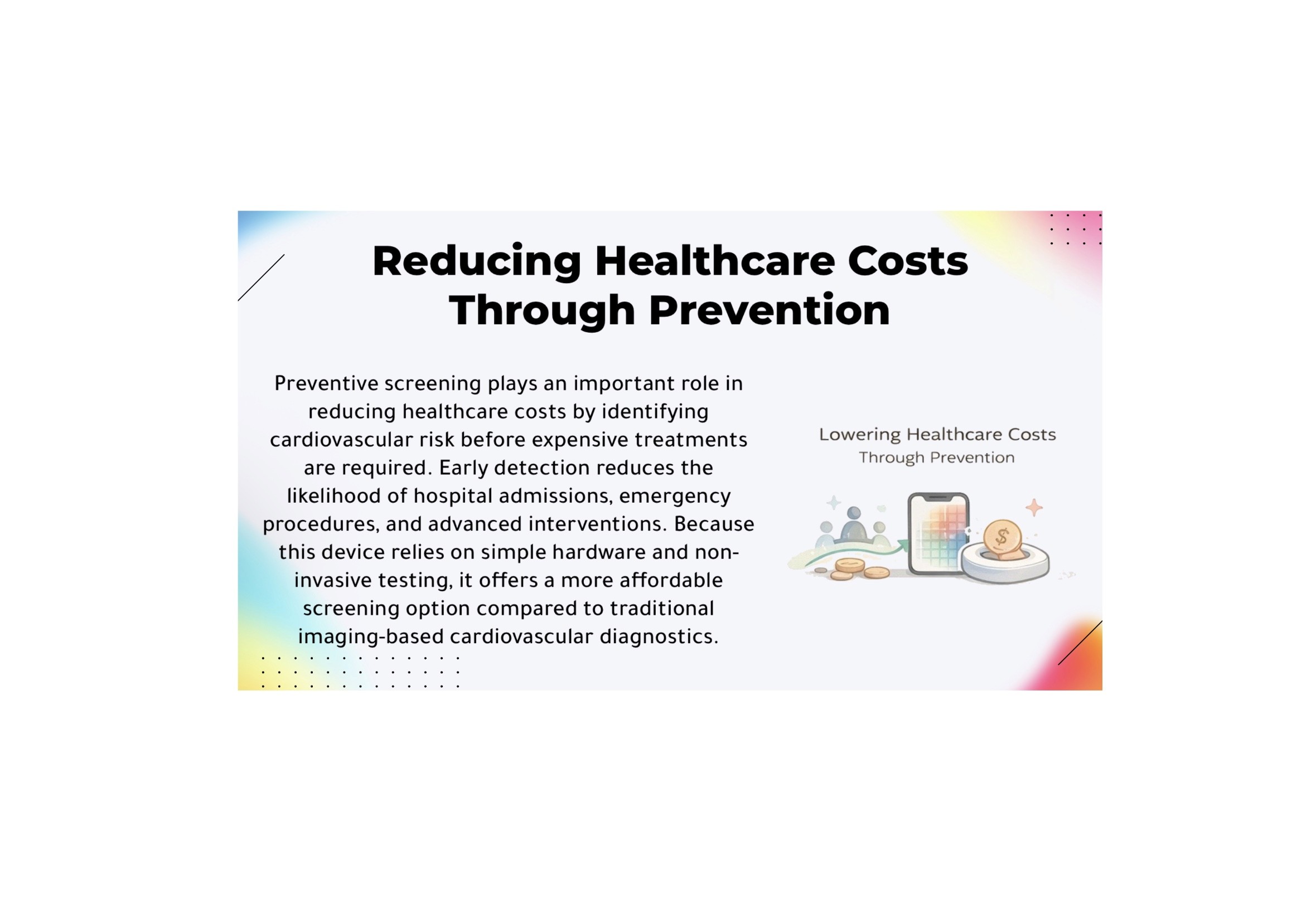 Cardiovascular disease is the leading cause of death worldwide, yet many people with early-stage vascular disease show no visible symptoms. By the time heart and vessel disease is detected through traditional methods such as stress testing or advanced imaging, significant and sometimes irreversible damage has often already occurred. Many screening tools are also expensive, invasive, or inaccessible for routine preventive care, creating a critical need for a low-cost, non-invasive way to identify cardiovascular risk earlier.