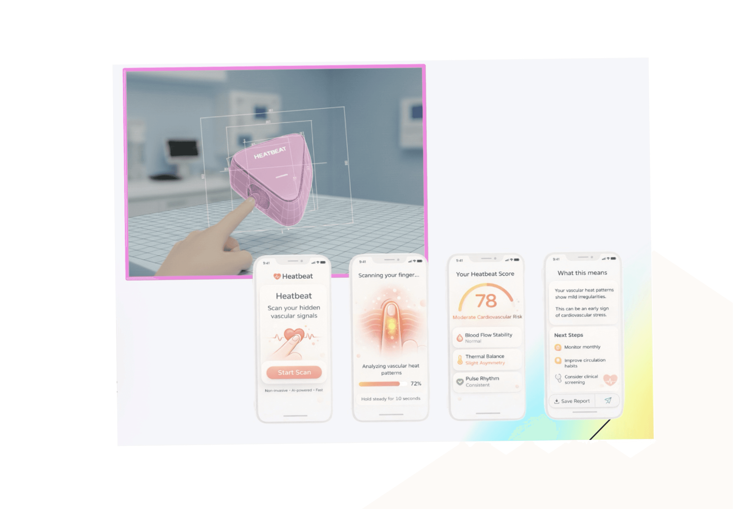 The key challenge was translating a subtle physiological phenomenon into a measurable screening signal. Heat transfer differences are small, and meaningful interpretation requires both consistent thermal data capture and intelligent computational analysis. Building HeatBeat meant designing a workflow that could reliably record fingertip heat response while developing an AI-based approach capable of detecting vascular patterns that are not easily visible through traditional evaluation methods.