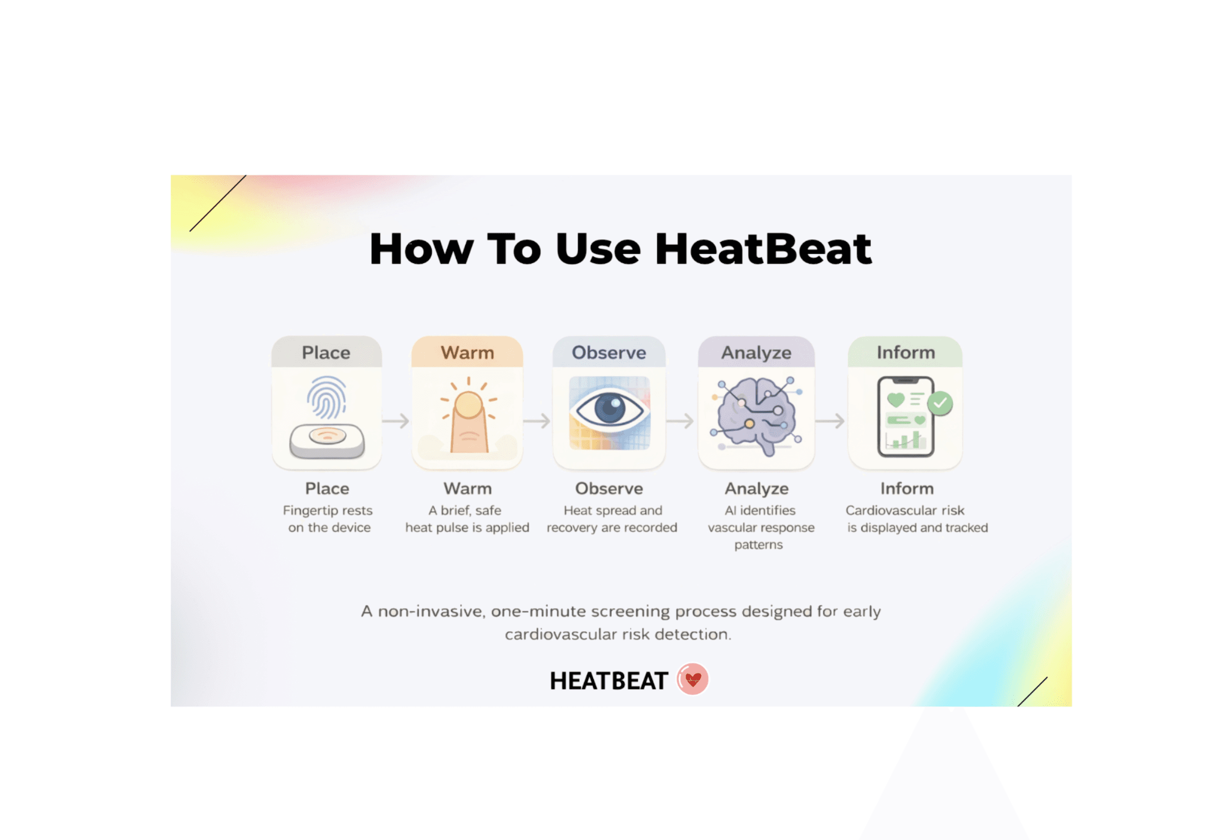 HeatBeat is a non-invasive cardiovascular screening innovation that uses fingertip thermal mapping and AI pattern recognition to detect early vascular dysfunction before symptoms appear.