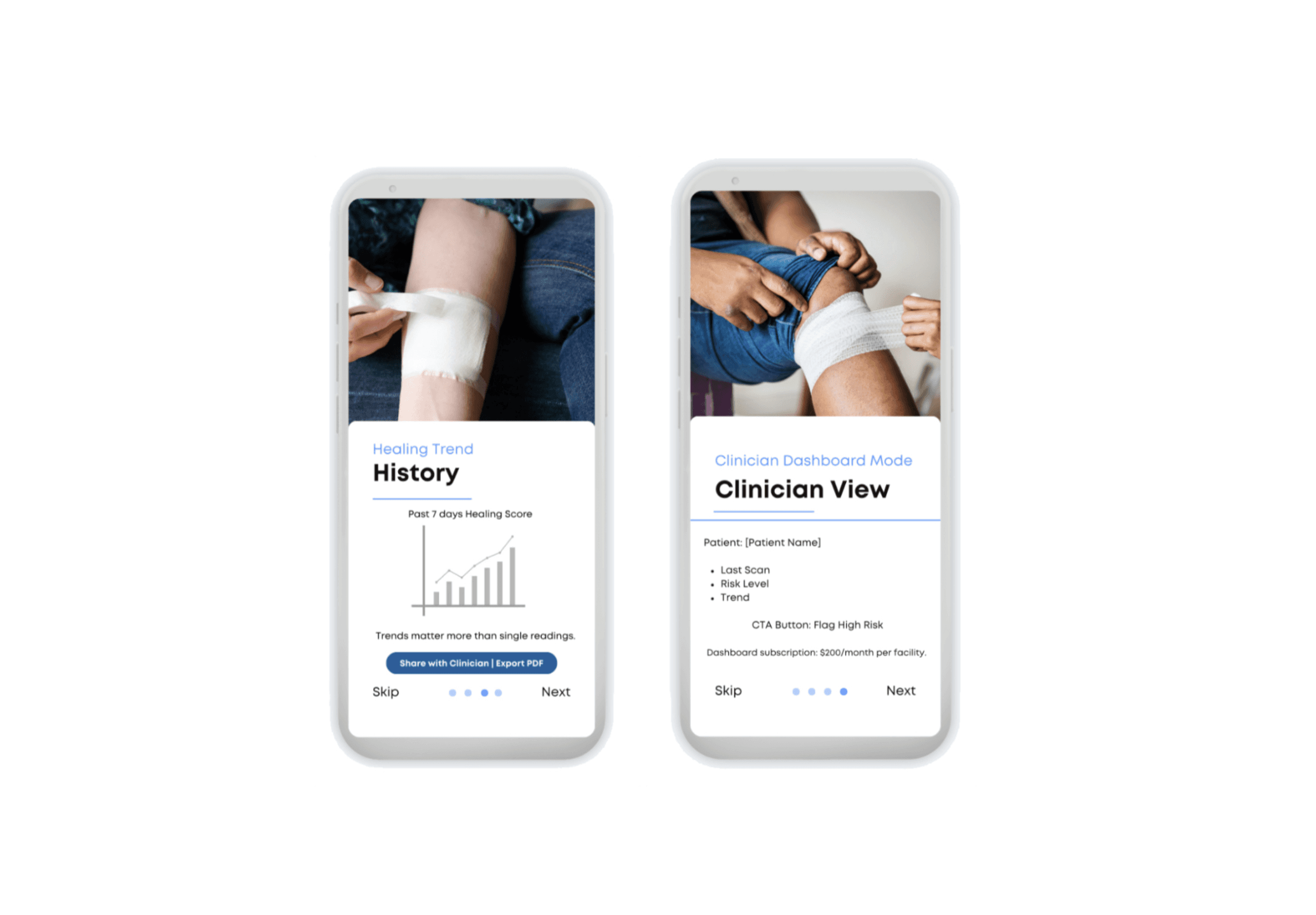 WoundWatch required a completely different design approach from my cardiovascular projects. I had to think through new clinical workflows, different sensing needs, and a scanner-like shape that was both practical and medically realistic. Ensuring the concept was technically distinct while still feasible was a major part of development. Scaling the solution also required designing a business model that works directly with hospitals and surgical care organizations rather than individual consumers.